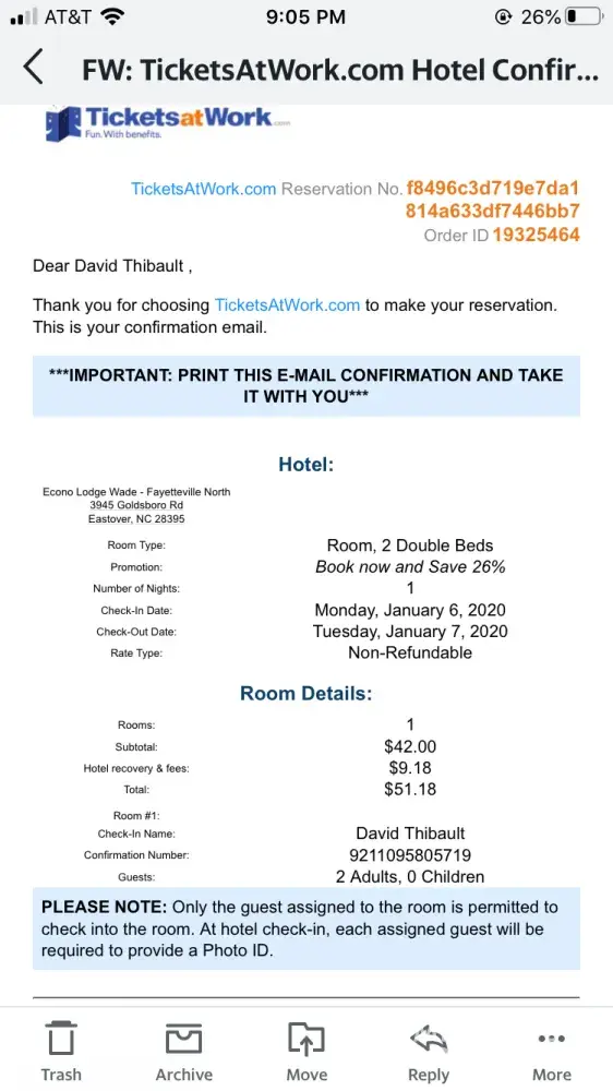 My wife and I went on a road trip at the beginning of the year. We used Tickets at work to book the hotel/motels we stayed in. On the 6th of January, we needed a motel to stay in Fayetteville, North Carolina. On the website of Tickets at Work was offered a room in Econo Lodge Wade - Fayetteville North on 3945 Goldsboro Rd, Wade, NC 28395. There were pictures of the room and a full description of the motel. The price was good for us, and we have stayed many times in Econo Lodge so we were ok with the offer. We booked our room and drove to the motel. Upon arrival, we noticed that there are no signs or the logo of Econo Lodge on the address that we were provided when we booked our motel room. When we checked on google we realized that Econo Lodge was permanently closed. The building that probably Econo Lodge once existed was not renamed and owned by OYO hotel or DaysIn, I can't say with certainty since there were two different signs on the building. We reserved Econo Lodge because we trust the company, we have stayed before and we are satisfied with what they offer. We did not fill safe to go to the building that was unclear about what hotel or motel is exactly. I called Tickets at Work and explained my situation. The customer service kept putting me on hold for a couple of minutes and in one part of the conversation laughing at me while I was trying to explain what has happened to us. I was told that that is the motel I have agreed to book and they as a third party cannot do anything about it, cannot cancel it nor refund me. I tried to explain many times that the motel I booked and the motel that is on the address is not the same but it was without any success. Finally, I decided to go to the motel and try my luck there. They had my reservation but I explained to the receptionist that I have booked Econo Lodge and want to cancel. After almost one hour of trying to cancel the receptionist said that the room will be canceled and we will be refunded. The next day my bank account was charged for the room at a motel that I do not even know the name of, never stayed there and was told it was canceled. I called the number I was given by the motel on the address I provided above, and even though they had my information the night before, now they did not have any information about me. I called Tickets at work and filed complain but was not able to get my full refund of 51$ but only a 20$ refund from Tickets at Work. The problem was not the amount but the fact that we have led to book a room in a motel that does not exist anymore did not receive any support from the website that provided inaccurate information (tickets at work) and were not treated with respect from their customer service.
