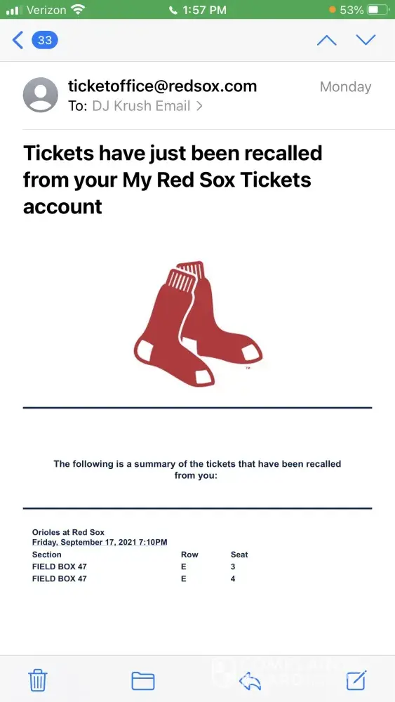 Bought Tickets thru Tickets @ Work for Red Sox vs. Orioles game on 9/17/21. I did receive the tickets and initially I was good. I was referred to download the tickets via "Ballpark" app. Then on 09/13/21 I received an email from Boston Red Sox tickets had been recalled. Gave no reason or who recalled them. I checked the app and yes those tickets were no longer visible or in my possession. Come game day I had no tickets. Tried to plead my case and was denied as all sales are final. I need help as to why they were recalled or by whom. As of now I've been ripped off $380. I just have no idea if I've bought something how can they be taken back with no reason or refund? Thank you