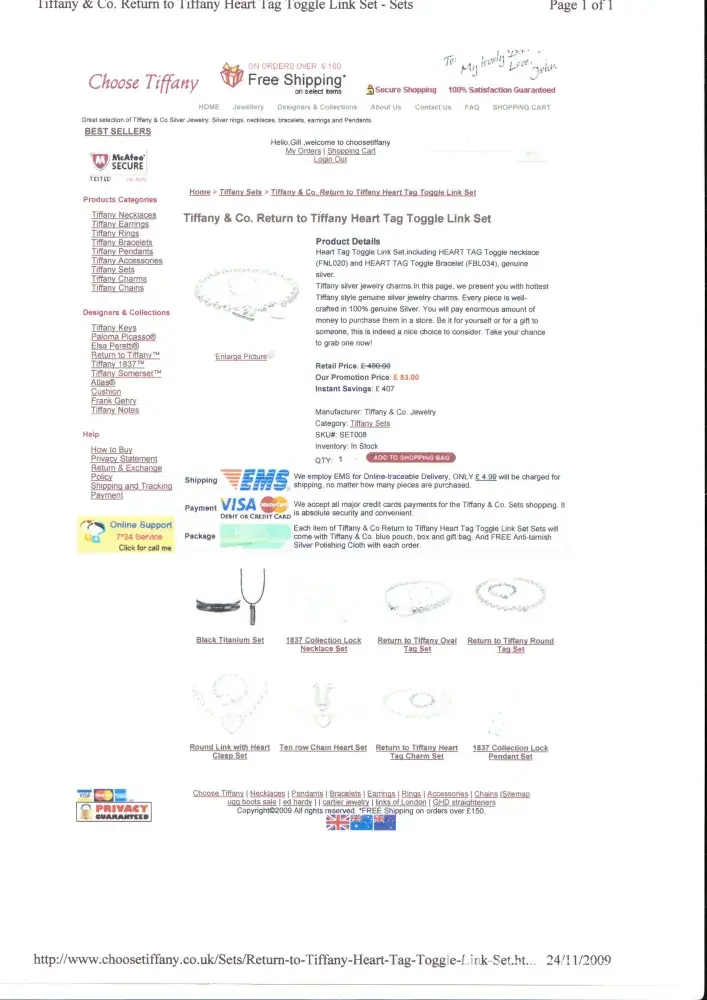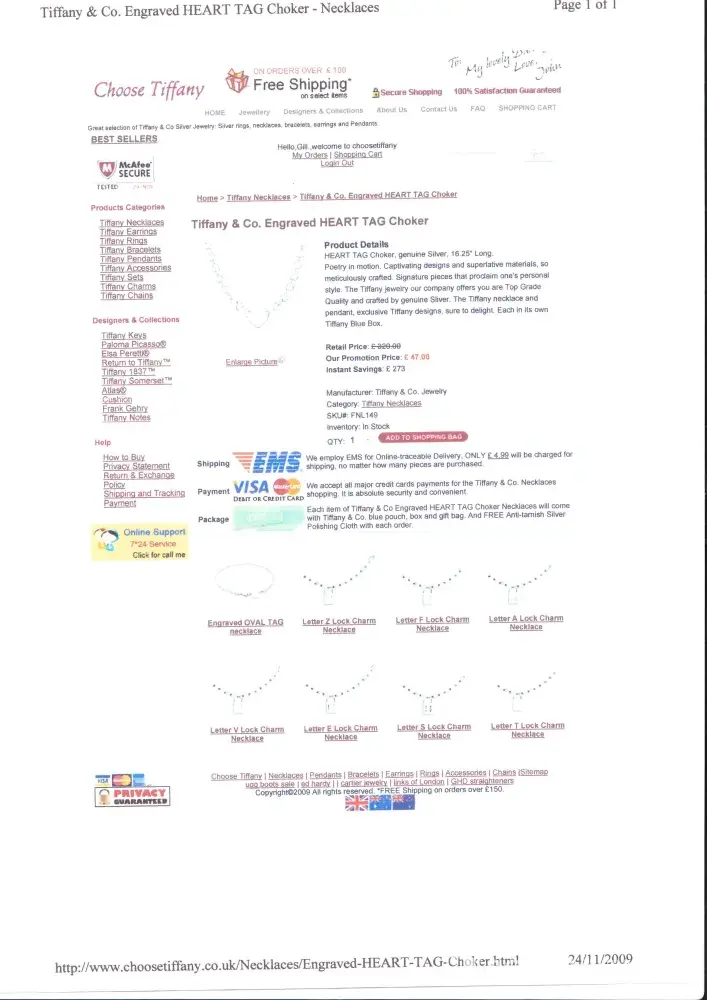 wow do i feel ripped off, i brought a necklace&bracelete set for £87.99 for my 40th Brithday in may, & was chuffed that i then treated myself to a choker type on august £42.59, i new they was not real tiffany but just love the style & only wear silver...on the site claimed 100% genuine silver...Well i took my necklace & bracelet set to be proffessionaly cleaned for them to go brassy & so embarressed when they told me they was definately not silver& rung me & to pick them up ...I got in touch with the site & they then told me they are only 70% silver!I told them i would get legal advise, & they then offered my minimal refund on several occasions & kept all my e.mails& saying i could keep them all.