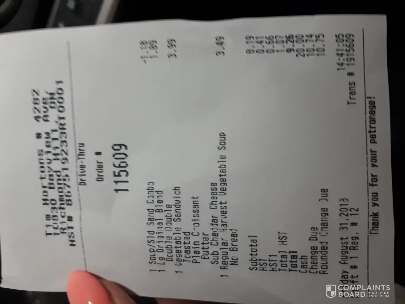 I am a frequent costumer at the Tim Horton's located at Bayview and Elgin Mills, in Richmond Hill Ontario. I am often disappointed with the food service I receive at this location. The only reason I still order from there is because the odd time I will receive the correct order and the closeness of the location. This a 24 hour location, as a consumer of Tim Horton's products I expect to have full 24 hour service if the location has displayed they are indeed open and serving 24 hours. Past 9:00 pm on any given day, this location is just about out of all food products. Customers are not able to order anything hot to eat except for soup and sometimes not even. I went recently and was told I am only able to order drinks and cold sandwiches such as chicken salad etc that was around 9:00-10:00 pm. It's upsetting that there is a sign in front of the store the reads " Breakfast Anytime" beside the "Open 24 Hours" sign, yet I can not receive what they are advertising. The crabbed customer service I receive on a daily basis is unacceptable, quite a few of the employees are rushed and careless with the orders. For example; one of my last visits all i ordered was a coffee coming to the drive through around 11:40 pm as I had just gotten off work. The quality of the coffee was as good as could be expected, although it was spilled all over the side of my door, inside and out, and my sleeve. This happened because the employee had not correctly fastened the lid on my beverage. she had such negligence for me and my order that she hadn't even noticed she spilled the coffee on me. I then told her as the window was shutting, and all she offered was napkins without an apology. Honestly I could go on and on about how this location is by far the worst I've ever been to. My most recent visit was today, at 2:41 pm. I was on my way to work so I stopped to get lunch at this location, this was a bad idea. I ordered a large Double Double, when I received the coffee it was a Tripple Tripple. I also ordered a plain bagel with tomato, cheese and lettuce, there were barely any toppings and I was charged for a vegetable sandwich instead of a bagel with extra toppings . lastly I ordered the harvest vegetable soup, I did not receive this, instead I was given chicken noodle. Not only did I not receive the right soup but I was not given the bun to go with it, and I was given a fork, not a spoon. I didn't have a chance to notice these mistakes until I was already at work. I am so very upset about these events occurring on a daily basis. I should not have to go out of my way to another location just because this one doesn't meet standards. I don't know if it is simply poor management or sheer employee based issues but I sincerely hope this location becomes more organized and starts to follow through with their advertising. This location is not representing the Tim Horton's brand well.