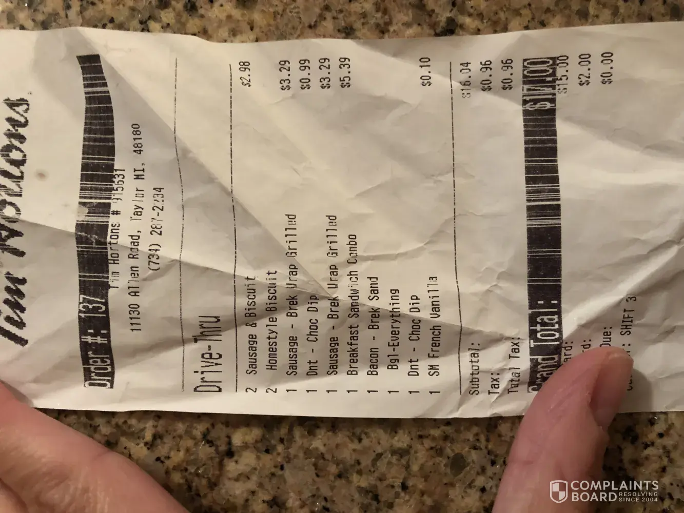 I recently visited Tim Hortons and was charged for 2 sausage breakfast grilled wraps when I only ordered one. The screen was not working so I could not see that she typed 2. When I got home and looked at the receipt, I realized I was charged for 2 and only ordered and was given 1. I called the store and left a message. I waited 3 days and got no return phone call. I would like to be reimbursed the 3.29 that I was over charged. Thank you.