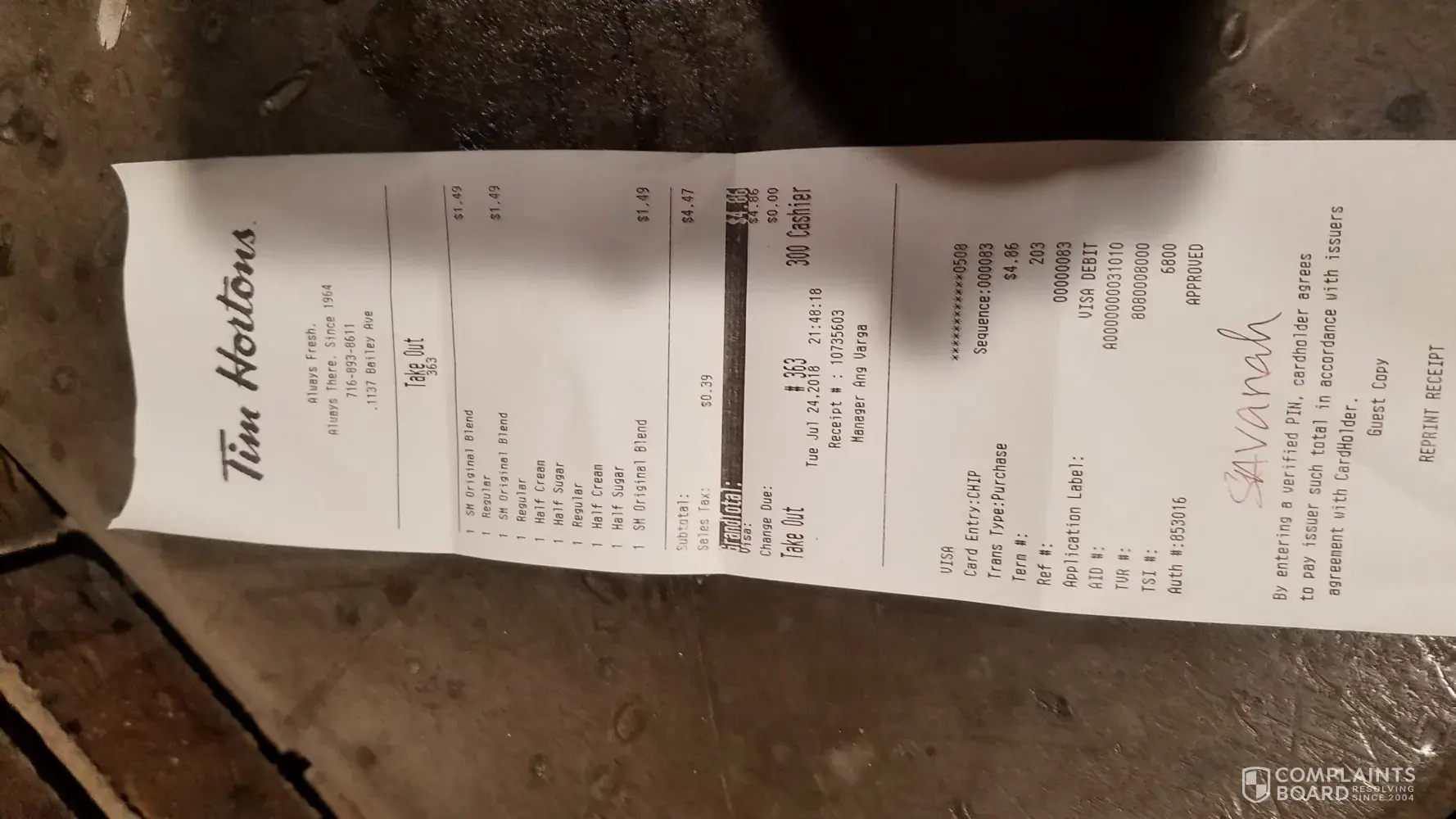 On the 17th July I visited TH in Waterford Ontario. We had done this in a TH nearly every day of our 3'000 km journey. A tea a coffee and a doughnut usually come to less than $10.00. However at this busy TH I was charged by contactless card $30.00. I was not given a receipt but a Medium tea and Coffee plus doughnut doesn't come to a lot. I feel someone is trying to take money from my account.