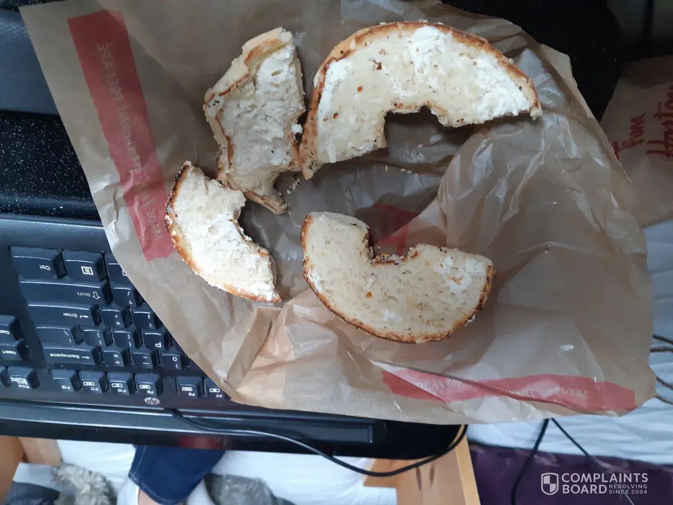 I received a bagel BELT on April 30th 2021. While eating it I noticed a strange taste and texture and spat out the piece of the sandwich I was eating. Upon further investigation there appeared to be a piece of plastic in the sandwich. It appeared to be a piece of plastic from the corner of a sauce packet or something that was cut off and ended up in the sandwich.