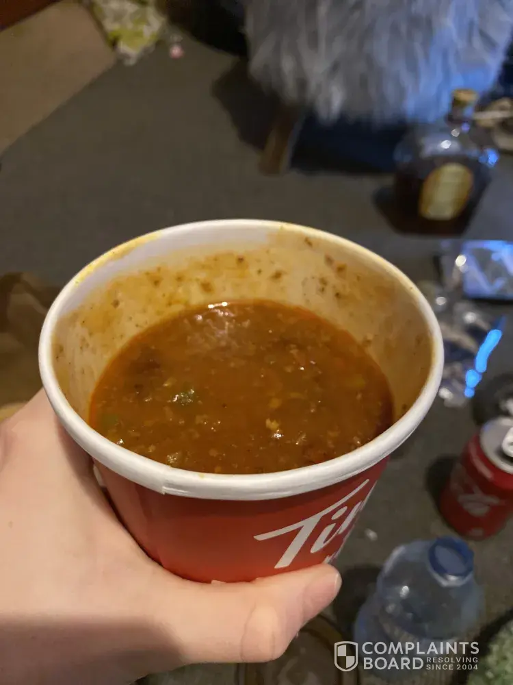 I ordered chili through the drive-through I ordered a large and when I got home I opened up my chilli and a quarter of it was gone!! Like it wasn't filled to the top it's like someone ate some of it and gave it to me I don't even know why bother ordering a large MIs will just ordered a regular I'm super disappointed I feel like I wasted my money and I want...