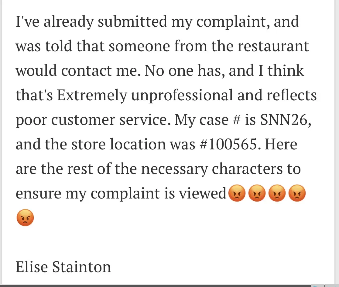 I've already submitted my complaint, and was told that someone from the restaurant would contact me. No one has, and I think that's Extremely unprofessional and reflects poor customer service. My case # is SNN26, and the store location was #100565. Here are the rest of the necessary characters to ensure my complaint is viewed😡😡😡😡😡