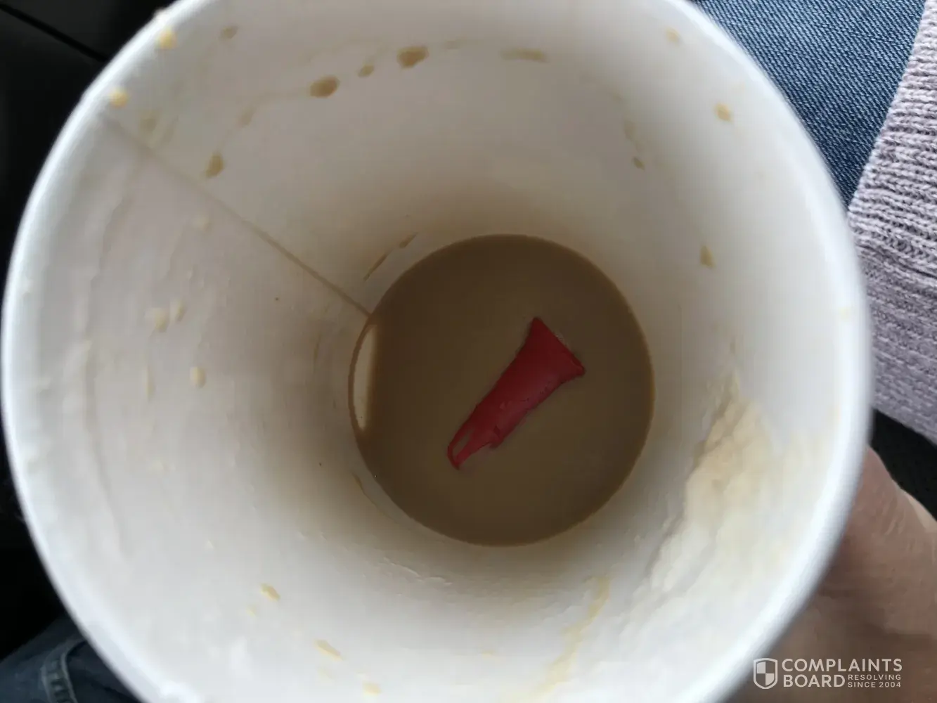 At 4:30 on September 29, 2019, I ordered a pumpkin spice latte, as I was finishing my coffee, I normally take the lid off to finish off my coffee, and as I took the final drink with my latte a lot cooler I nearly swallowed the red nozzle I spit the nozzle back in the cup and threw up . I am really concerned about any contamination that this may have.