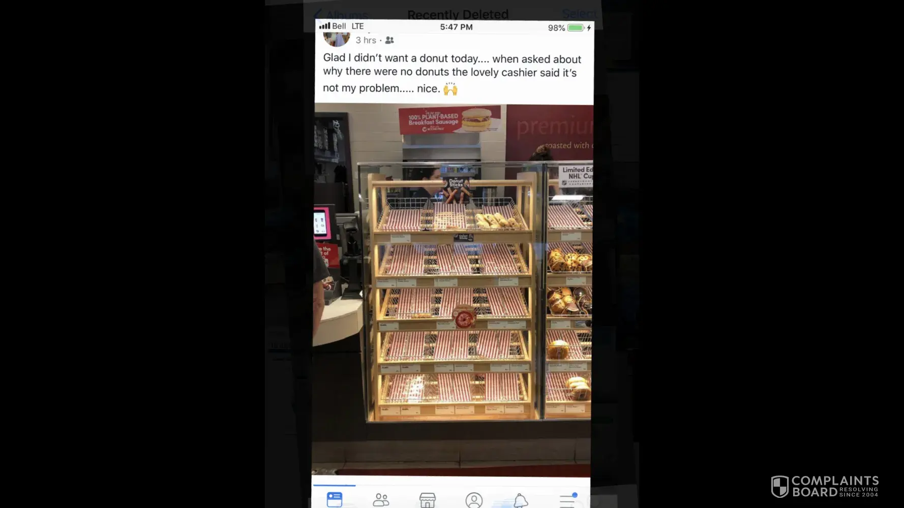 Tim Hortons Annapolis Valley, Coldbrook Nova Scotia. My wife was in today and snapped a shot of your empty display case which is not uncommon for the store. Terrible management .it's actually amusing to watch them buzz around and basically get nothing done.The cashier who served my wife was rude, and uncaring as to the quality of their service. Which is pretty typical at this location because this happens all the time. It is very poorly managed at this location. You should seriously fire your managers because you're driving away customers. I hope this will get resolved. Here's a picture for your enjoyment.