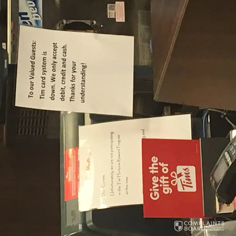 Other note says Dear Guest, Unfortunately we are not participating in the Tim Hortons Reward Program at this time...