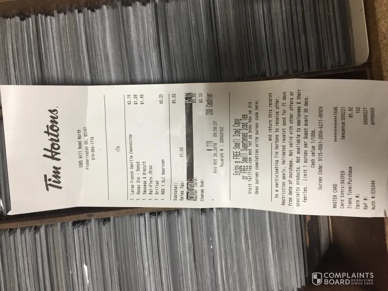 I came to the location Tim Hortons # 119 in Pickerington Ohio on 10/26/2018 at 9:50 am I have received the wrong order with my drink was suppose to be a cappuccino but instead after getting all the way to work and not being able to leave it's a coffee with cream or something that's not mine! I tried to call the store direct to getrjis fixed but that was a loss cause cause they put the number on the top of the receipt I have but they don't know how to pick up a phone. I have been calling nonstop and to think I will get some one only to find out after it rings 30 times it hangs up on you! Like are you kidding me you can't pick up a phone. So now I'm at work no drink and can't leave till 3pm this isn't the first crappy experience I have had at this location I would like an email back telling me what will happen and my bad experience I had today and now nasty coffee breath which I hate coffee!