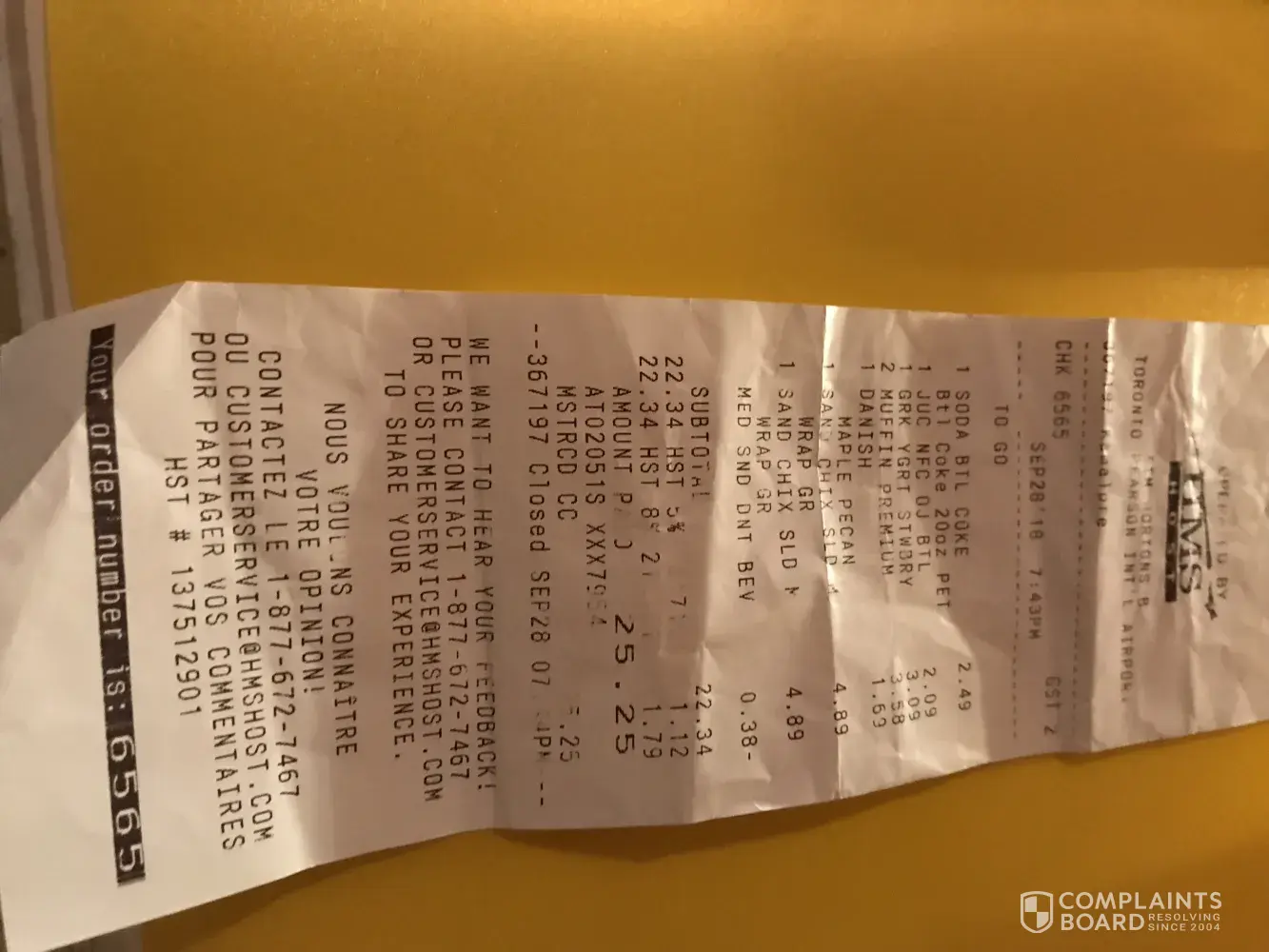 I purchase two chicken salad wraps at Toronto airport to consume on my flight. Just prior to boarding I went to take out the wrap and give one to my husband and it had been heated up. Too late to take it back to the kiosk. I specifically asked the cashier which wrap was cold since I did not want to consume it for sometime and she adviced me that the wrap was cold. This could be dangerous . I have attached documentation. See bill and open wrap 2 wraps At 4.89 each plus 13% tax