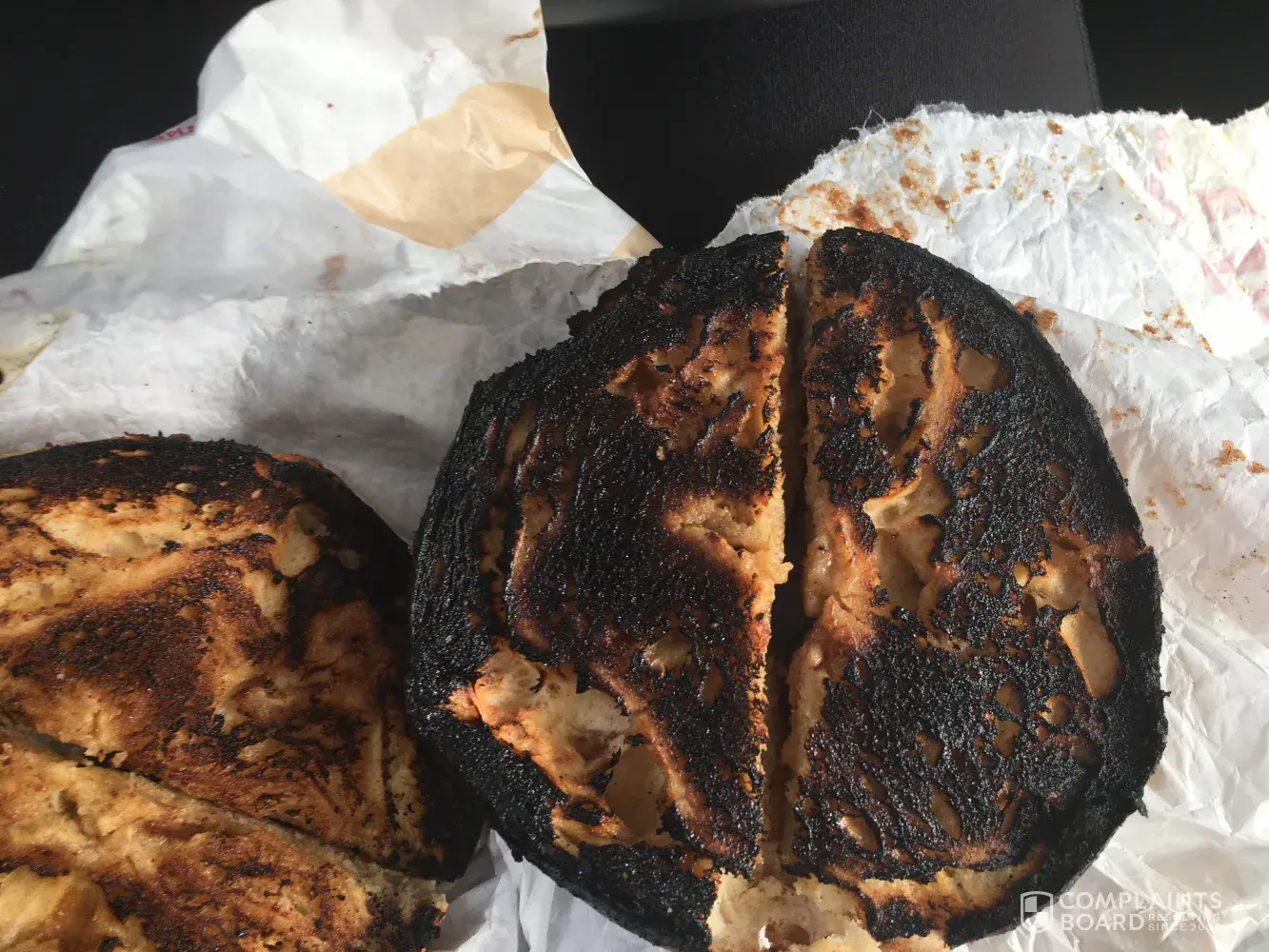 I ordered a bagel double toasted as usual because normally it is barely toasted with one time. Today I was given a completely burnt bagel on inside and soggy on the other. Why would someone even give that out, common sense would be to remake it.