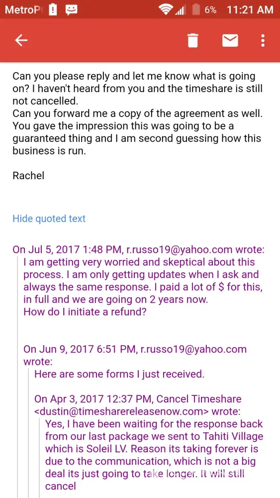 Please beware of this company! they took my money and did absolutely nothing! they promised to get me out of my timeshare and i have not heard a thing since. I googled the name of the supposed owner "dustin lemlin" who is operating under an alias "dustin michaels" and is apparently guilty of drug trafficking! please do not even consider dealing with them!