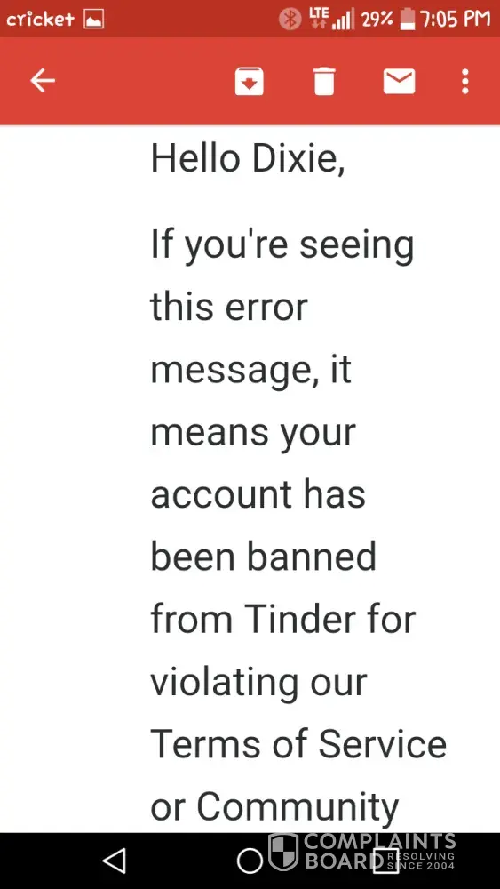 Hi there! My account on tinder was banned for no reason whatsoever. I had my account set up for less than a couple of hours. I had swiped away; did not match with anyone so I didn't even have a single conversation. The next day I went to the app and I couldn't log-on/received an error message; I sent them an e-mail asking why I couldn't log-on and they replied saying I had violated the "terms of use or the community guidelines in some way". I emailed them asking to advise what rule(s) I had violated, they simply said "they take violations seriously …. Unfortunately cannot provide any more detailed information" and I was to re-read all the terms of use (which I did). And they said they "do not offer appeals". I actually took the time and have read through the terms of service and community guidelines and for the life of me cannot find any violation I may have allegedly committed (?). All I want to understand is why the ban, and allegedly which rule(s) I broke. I also did a search online about tinder bans, and found so many complaints about no reason for banning users. I will not use the tinder app ever again (and apparently they will never let me), but I would like for them to provide evidence of my guilt and I would like my name/account cleared. Innocent until proven guilty. I also wonder if users who were banned for no reason can "ban together for a reason" again them …