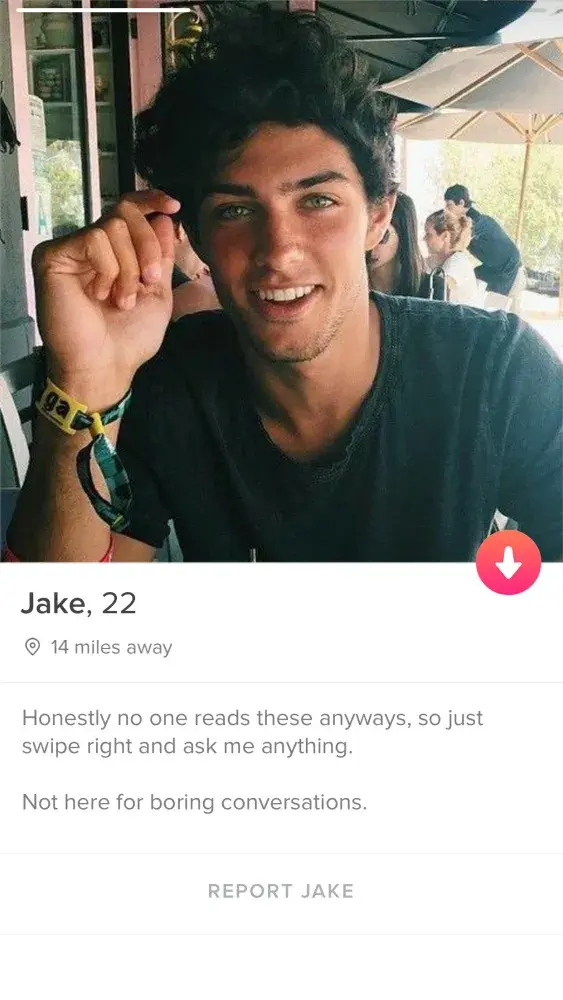 Someone is on tinder using the name Jake and is currently using my pictures as their profile. I would like to be resolved immediately because I do not want my pictures out there for other people to get hurt from a catfish. Two that's freaking creepy and weird that someone is using my pictures as a profile. 3 I do not want my name being thrown out there for other people to talk about