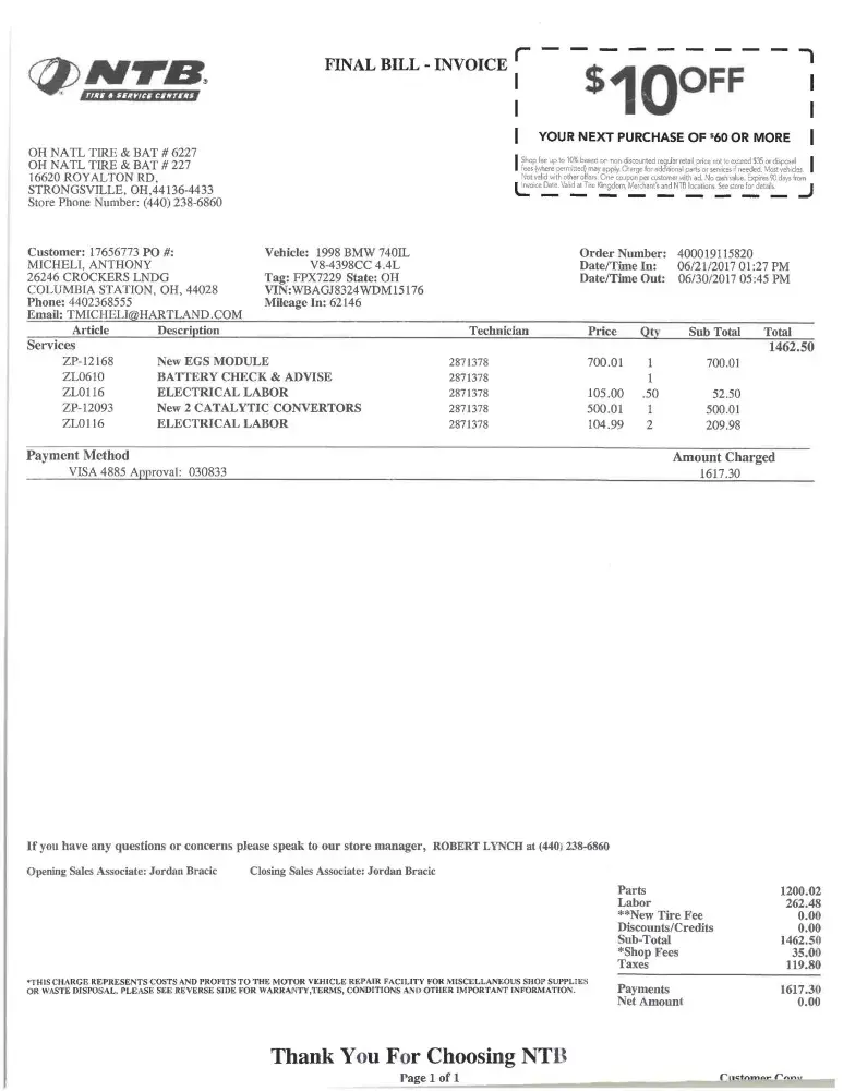 We were also charged for 4 tire disposal fee. We only had 3 tires disposed of because the old tire was left in the trunk.