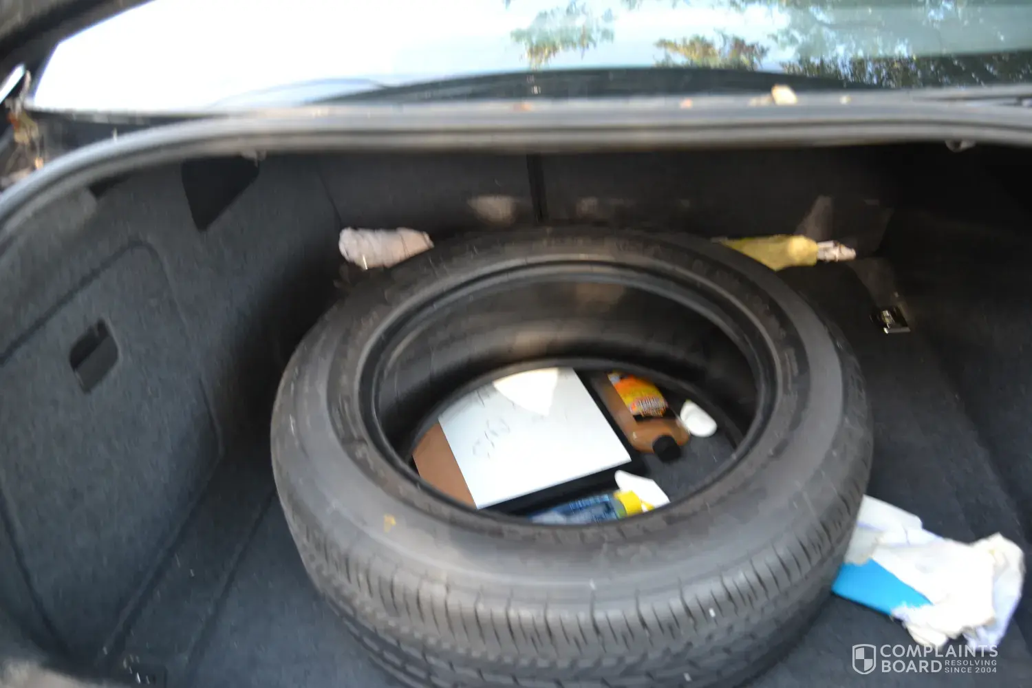 We specifically asked that the spare on the rear passenger side be removed and placed in the trunk and put the new tire on the rim in the trunk since the tire in the trunk had blown out and we had to put the spare on the car. Prior to leaving, we asked Jeff if he understood and wrote it down. He said he did.