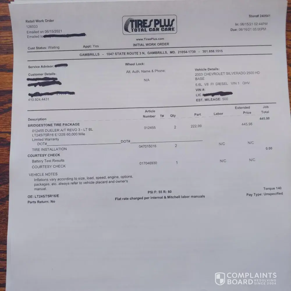 Read full complainttire service