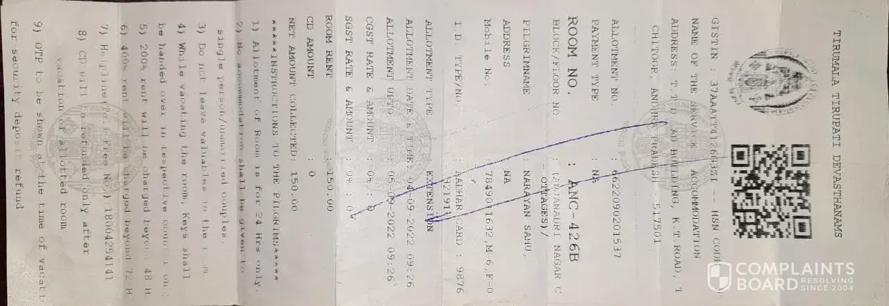 I travelled to tirumala and me and my husband stayed in hotel srinivas on 30sept 2022 till 1st oct 2022. My booking id is: IA04092276572971.