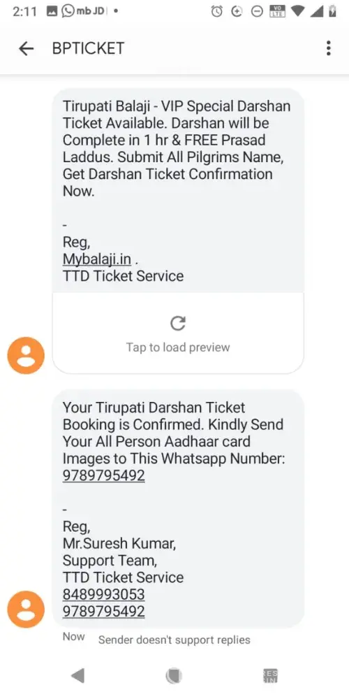I was booking for e special entry darshan through ttd on line website and was directed to www. balaji.in on 19 august 2019. I furnished all details as per sms received and also messages on whatsapp. On filing all details like Name and adhar card for all the 9 members, they confirmed that tickets are available for the confirmed slot my requirement. I got message that, ttd support person Mr Sureshkumar can be contacted for any details on numbers 8489993053 / 9789795492. Then was directed to payment though payumoney for Rs 3600/- only. The payment was made thruough credit card, then screen appeared as payment successful. Payment ID TRHOWOGE appeared on screen saying support team will call in 2 hours. since then I have called 100 times from last 6 days but no response. Then approached TTD, they said It is fake website. They also told they are getting lot of complaints from customers daily. Although money is gone, but question remains as to why TTd has not taken action against this duplicate website. Everyday hundreds of people are getting fooled and loosing money. The IP address on investigation was found to be in Singapore. Also lodged police complaint but no solution till date. please be aware of such fake websites and ttd must strongly advertise against not to use such websites and automatically guide to proper on-line booking.