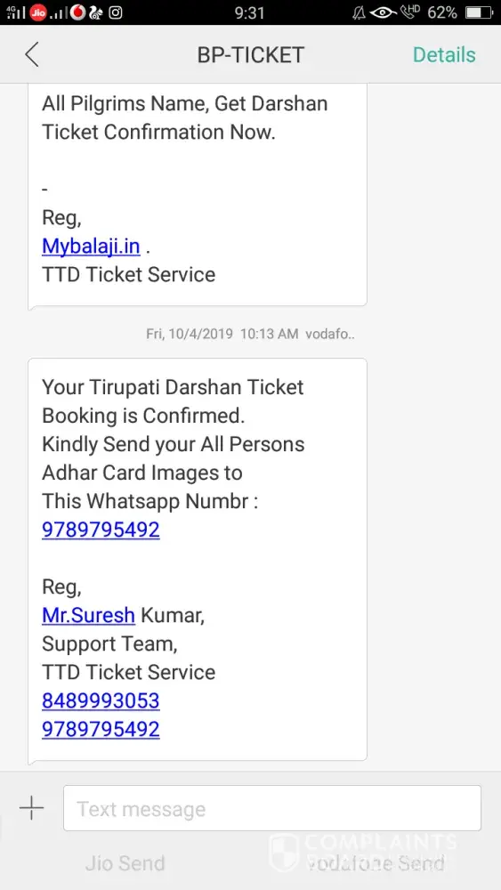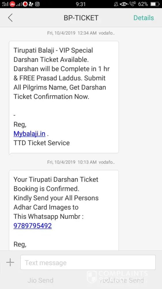 I have hereby attached a copy of the messages received and the booking website. Kindly look into the issue and do the needful.