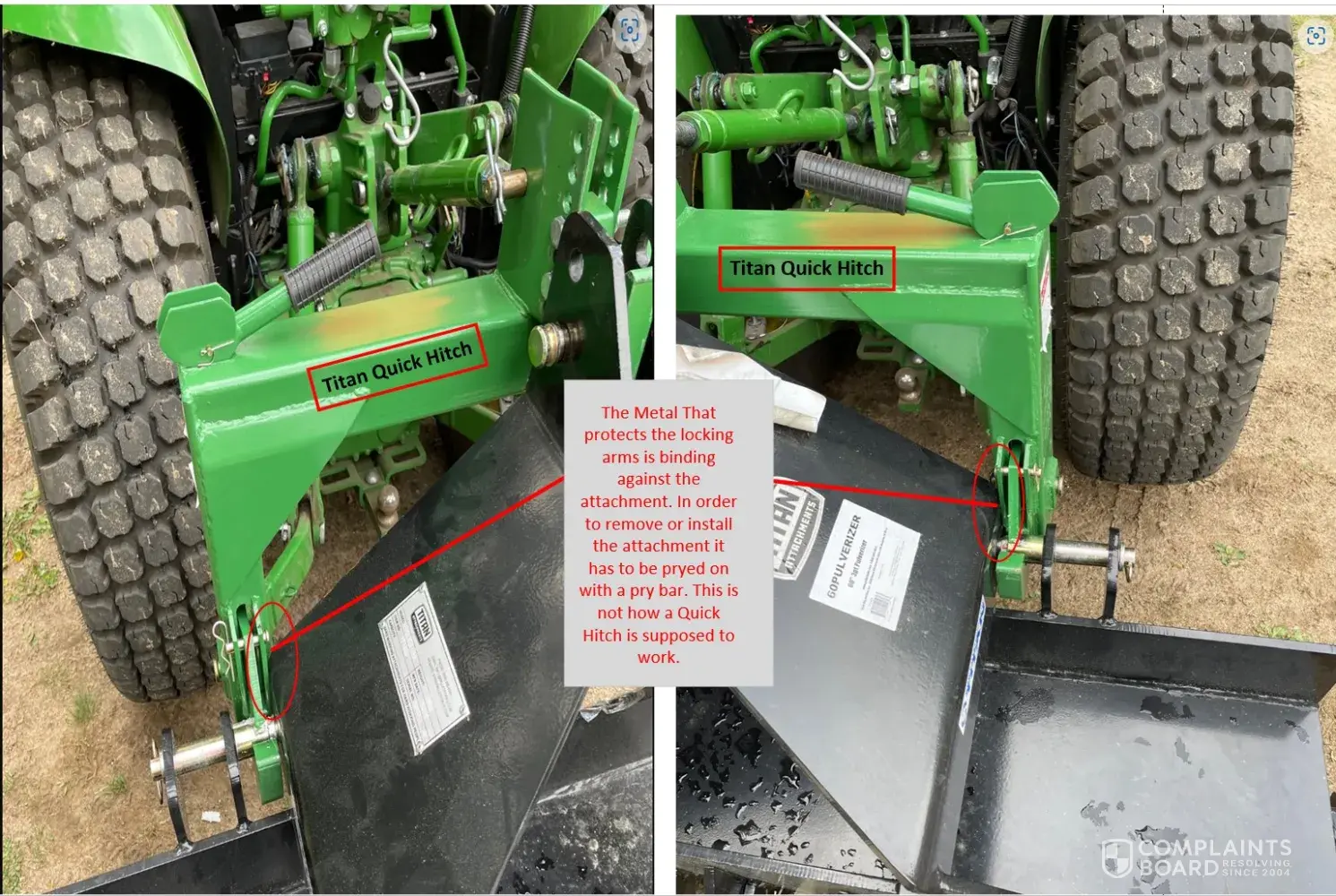 I purchased what was supposed to be a quick hitch compatible soil pulverizer attachment, upon trying to connect it to my tractor i found it did not fit. I then ordered Titans quick hitch and it is so tight it has to be pryed on and off with a long bar (not how quick hitches work). After going back and forth with product & warranty support i was sent an Email stating that the quick hitch does not work with that attachment, and they will be changing their paperwork to reflect that it does not work with a quick hitch. Since i have 3 quick hitch attachments and this is not compatible i asked them to pick it up, which they said they will have to get back to me. After almost 3 months and numerous calls and the supervisor will call you back today no one has called me back or sent me an E-mail. Whoever is in charge of Product & Warranty support has been ignoring my calls since they sent me an E-Mail on June 14,2023 stating it would take 2-4 business days to resolve the problem. Titans claim #1756005.