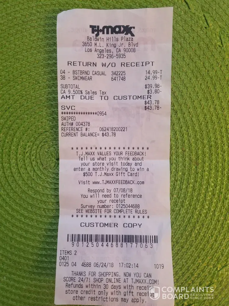 I immediately drove to the closest TJMaxx store located in Los Angeles, at the Crenshaw plaza shopping mall and asked for help. A helpful TJMaxx representative there took our returns, the same returns that we could get full refund in the Culver City store, and without any questions issued the full refund and gave us the TJMaxx store card for the full amount (copy of the store card receipt attached).