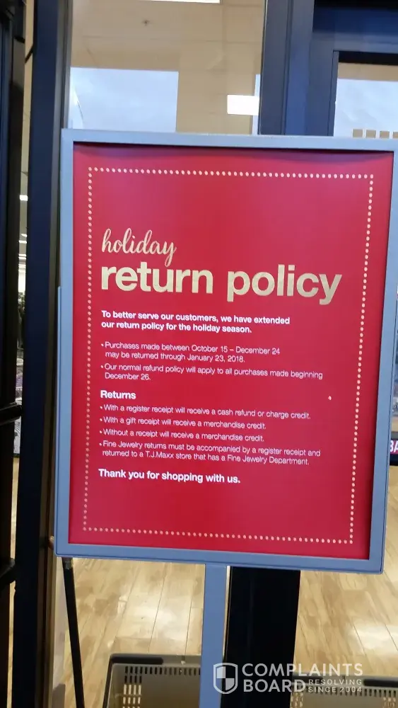 I went into the store on January 2 to return some Christmas gifts. Their sign said that I did not need a receipt and that they would give a store credit. I waited in line for 30 minutes and the clerk said that they only accept returns with a receipt. I told her that the sign says otherwise and she held firm. I asked for a manager, Salma, and she said the same thing. When I told her that they should take down the sign if they have no intention of honoring the policy, I got a rude stare and no reply. I walked out and cancelled my TJX rewards Platinum Mastercard and will not be returning.