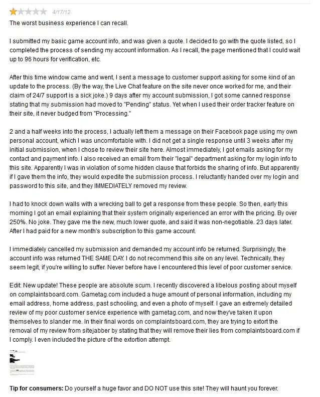 You did post a rebuttal to my Gametag review on SiteJabber. That was "fair", even though your rebuttal was posted over a year and a half later and was completely falsified. My review of Gametag was posted with the events fresh at hand, with no bias, exactly as I described them.