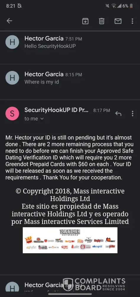 I meet someone on mingle 2 we started talking and for us to meet i needed this safety insurance ID card and she gave the link so when i tried they took 80.00 dollars from me and then they said it could not be verified so they said i needed to get a prepaid visa card for 100.00 when i got that they said i needed another one of 100.00 for delivery and when no they said the only way i could get my money back was when the process was completed.Now they are saying i need another 100.00 for the delivery an finishing the verification.When i said no they said i wasn't working with them and they said the only way to get my refund is to finish the process.please help me. I have all the emails to prove it.