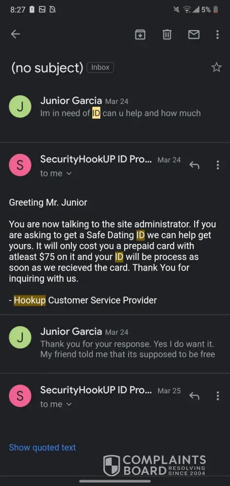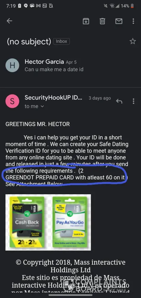 I was told by one of the girls I met on an online dating site that I can get my hookup id from her admin so I contacted them and he told my I needed a geendot visa prepaid card with 75.00 on it. Then I spoke to hom again and said I needed 2 of them with 60.00 on each one so I went n bought them I sent if to him and he emailed me again telling me my id was on hold until I send 2 more cards with 60 on each one again wtf hell no I want my id now or my refund.