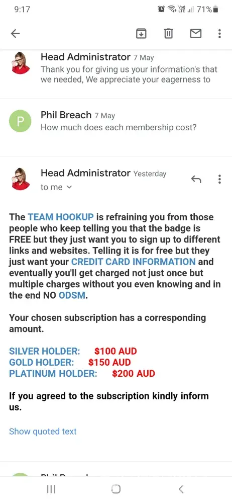 but something happened when saw her picture. We texted back and forth. Supposedly wanted to meet but I had to get an Security ID badge. I said ok. They had different leaves from $300 for verified for 3 month up to VIP 3 MORE goods for 12 months paid 300.in prepaid debit cards