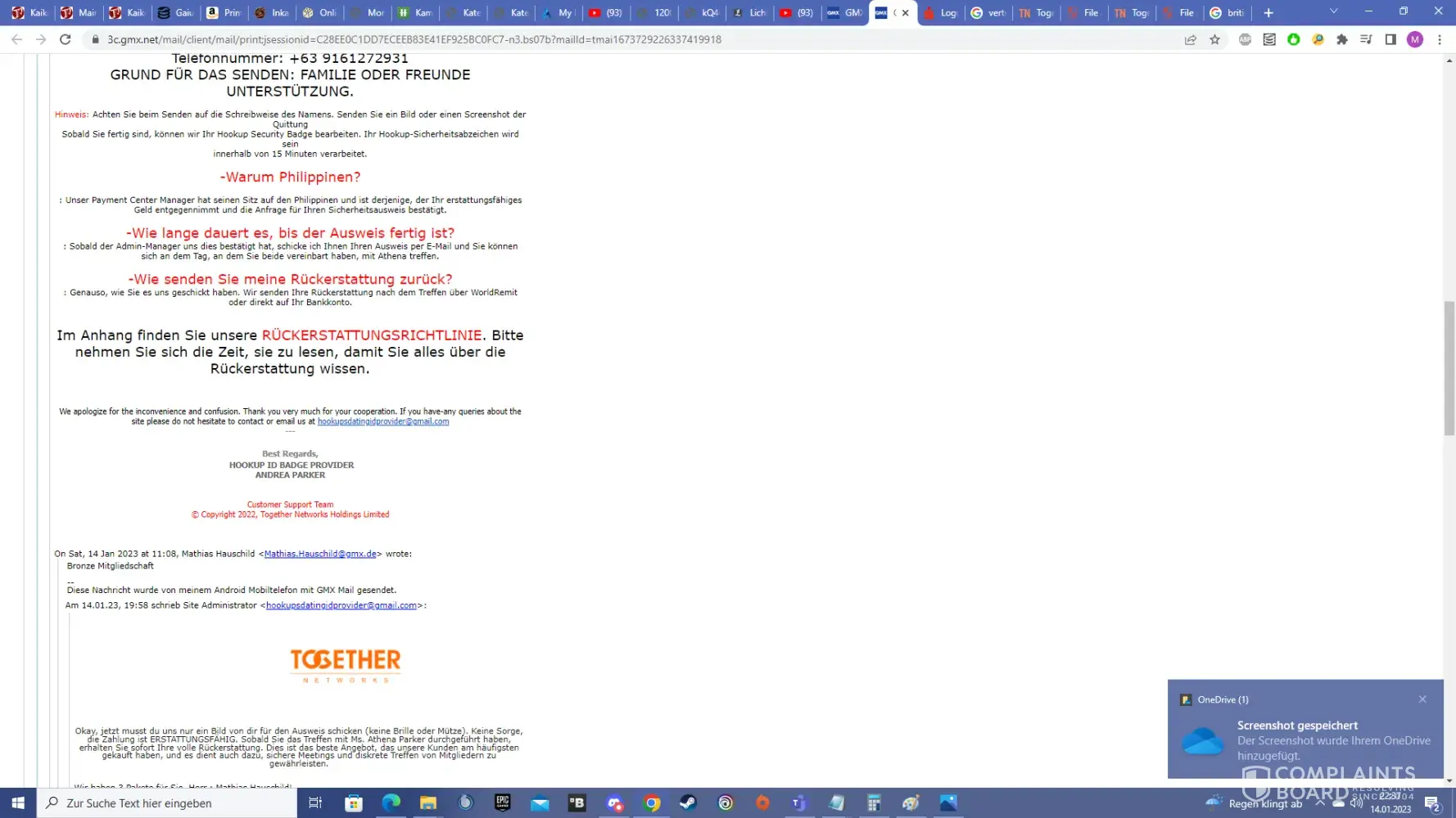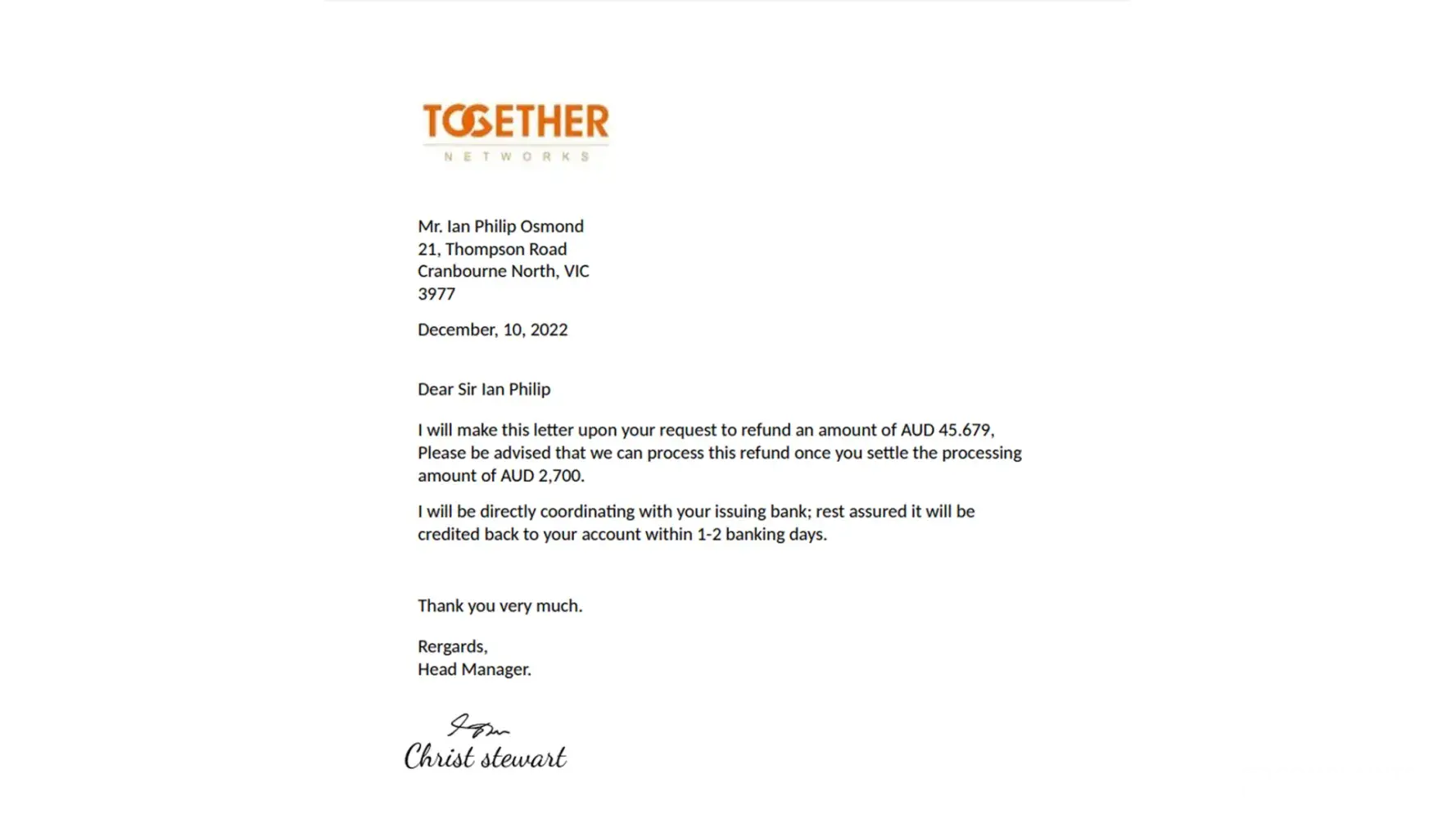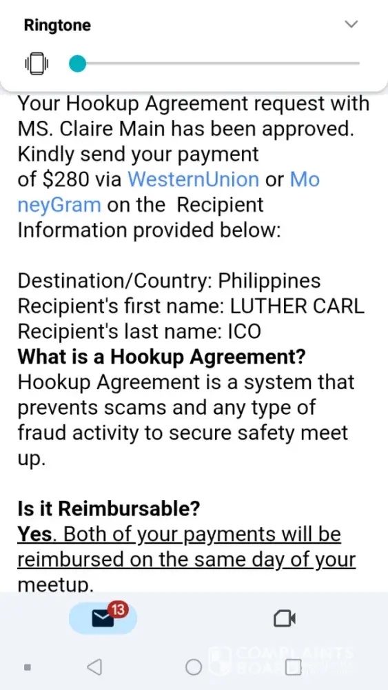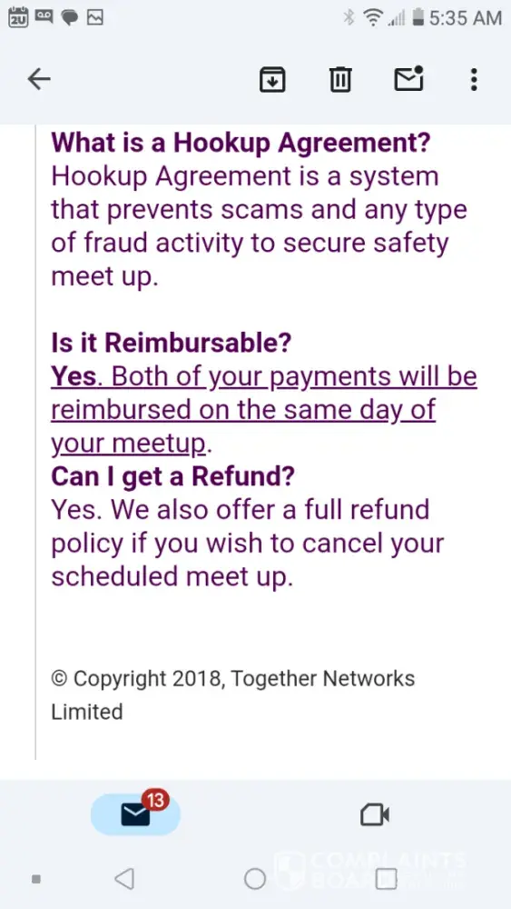 I was told by a girl I met online about getting a meet up Id to meet her she sent me admins email from together networks they asked for 200 for a membership after I sent that they then asked for 1200 I also sent that because I was told I would get a full refund when done after I sent that payment I was then asked for another 900 I have told them that I ain't sending no more money and I want a full refund but they keep telling me I can't have a full refund until I make the final payment