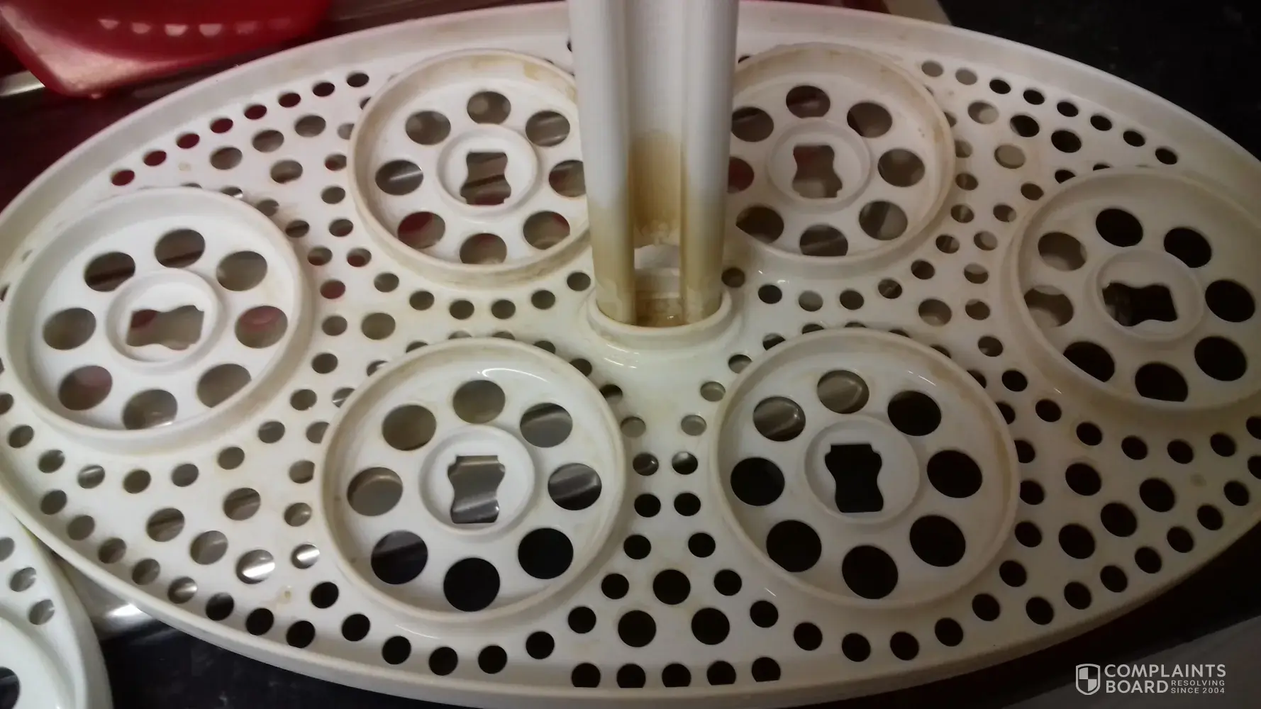 Hi, I bought the Tommee Tipee Sterilising & feeding set from Mothercare, some time in June 2017. Started using on 12/07/17 after born of my son, using it for a month or so, now the sterilising plate inside is discharging some fluid kind of thing and also the coating is coming off. I have water softener at home, so there shouldn't be a case of hard water or scaling.