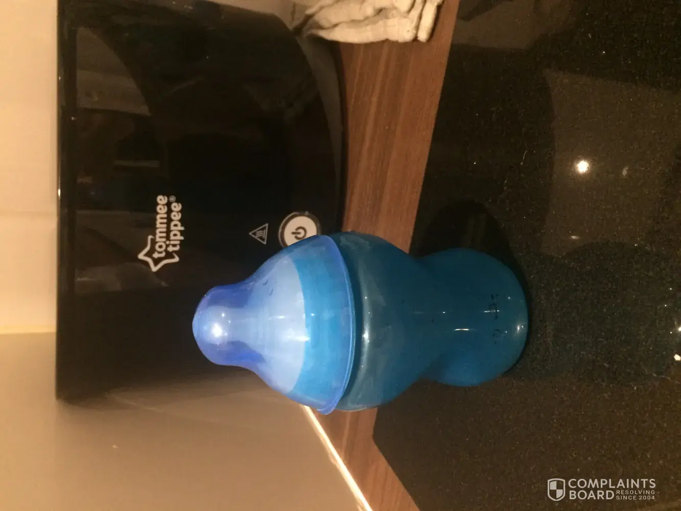 I am writing today to complain regarding the Tommee Tippee steriliser and bottles I bought from yourself. After receiving the steriliser, my daughter was born on the 25/03/17. I started using your products after being recommended by numerous individuals who rates your products as 'brillant'. Unfortunately my experience hasn't lived up to my of expectation of the name Tommee Tippee. I received the Steriliser and 4 bottles (two 9 oz and two 5oz bottles) after a week of using the Steriliser the bottom of the Steriliser started to show a brown marking. So I continously tried to clean it but unfortunately it has gotten worse, too the point were I am no longer using your products. I was concerned when I realised it was limescale. I found this to be a concern and and worry as my daugter was a week old. This could of had a impact on my daughters health. To add the bottles we recieved, the oz marks printed on the Plastic are now coomig off. Which is another concern when pouring water I do not know the correct marking on the side of bottle. I now know I will not purchase anything again from yourselves, which is a disappointment as I know how popular this company is.