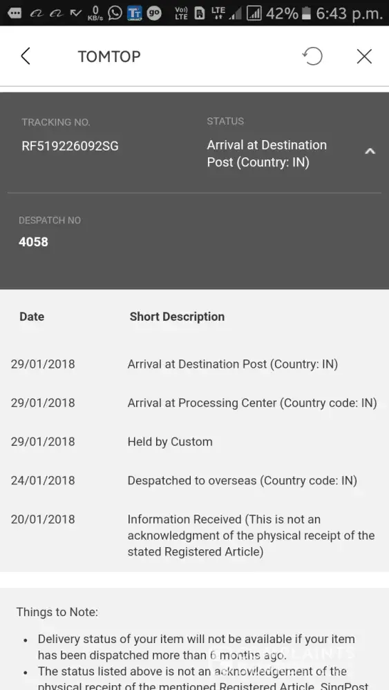 The above order number has reference and tracking number RU839507285CN. It was ordered 15/04/18 and there has been no follow up from TomTop to advise of progess etc.