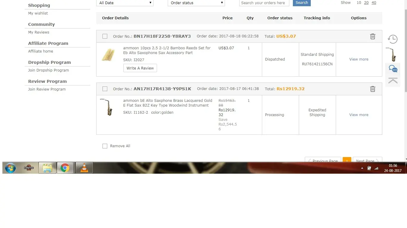 I placed an order for a saxophone (Order Number: AN17H17R4138-Y9PS1K) on 17th of August, 2017 via expedited shipping but the order has been stuck under "processing" since 17th. Please assist me with this since I have tried the chat-assistance feature with no proper guidance. I'm very agitated since I have a performance coming up and I ordered this saxophone because it promised decent quality for the price and the shsipping time was also 7 days but it hasn't yet cleared the processing phase, I'm not sure what's happening, PLEASE fix this and send me my order.