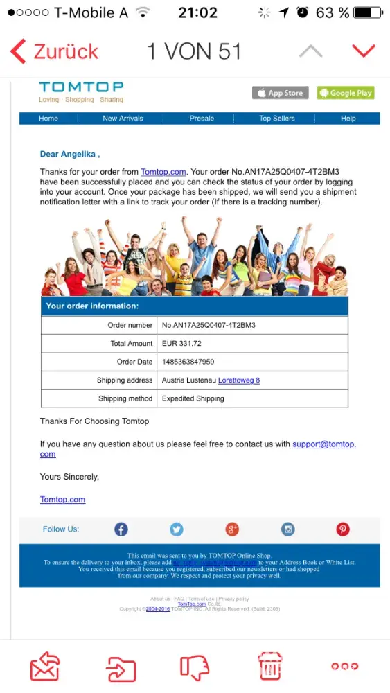 To ensure the delivery to your inbox, please add [protected]@tomtop.com to your Address Book or White List.