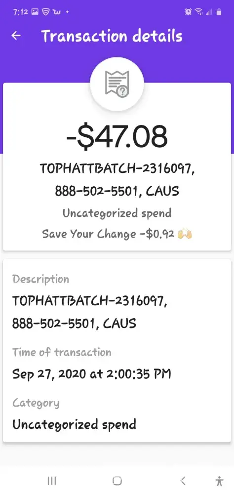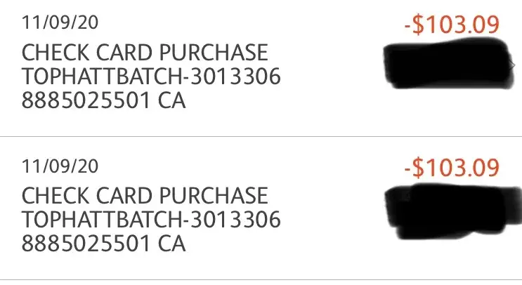 On 11/09/2020 Tophatter took money out of my bank account twice for same batch (#3013306 8885025501CA) in the amount of 103.09. I have emailed them and no response aft 3 days.. I have since tried to contact them via email again, with no response still! There is no phone number to call for customer service! This is ridiculous... I would like the money returned into my bank account. Thank you Karen Neil