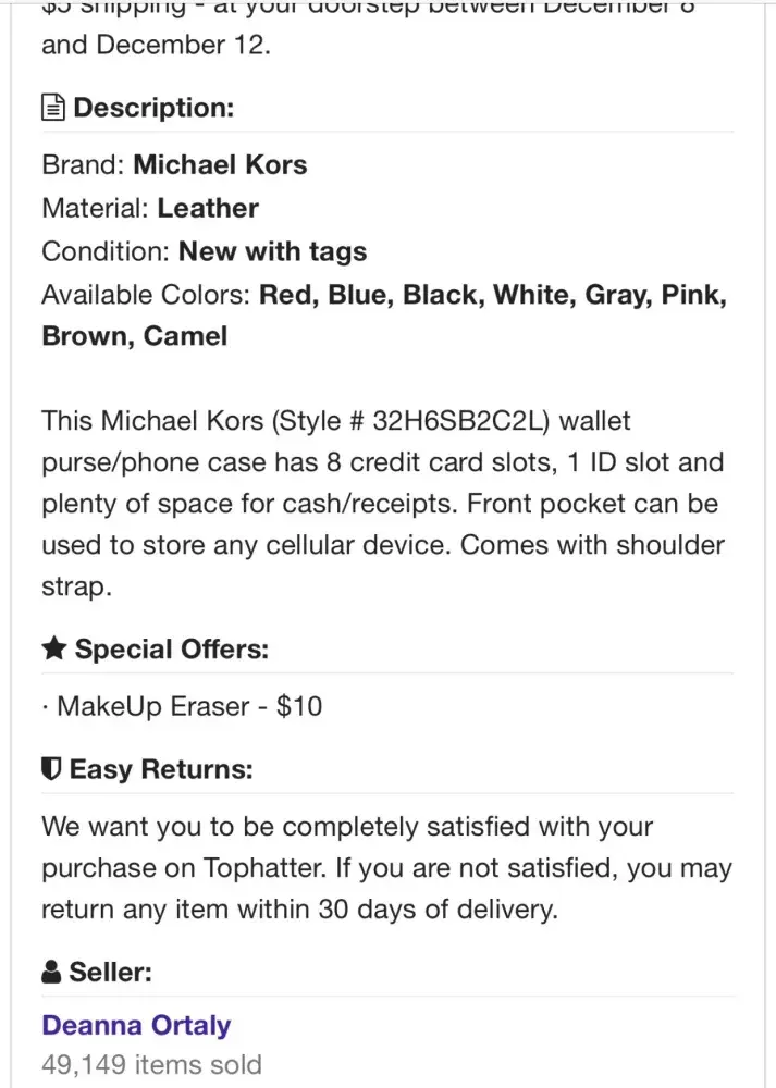 I to have been taken by her and Tophatters... you never get the same person on customer support and always get a different person. She now has 17 phone wallets of mine she will not refund me the money. Tophatters give 30 days refund and she gives 15 days. Tophatters say they will not sell anything that’s not authentic well trust me they are not authentic. I gave some for gifts big mistake! How can we stop her. Please be careful dealing with Tophatters and Deanna Ortaly one of the biggest mistakes of my life! On top of it I’m out close to $200! Here’s the proof...fake!