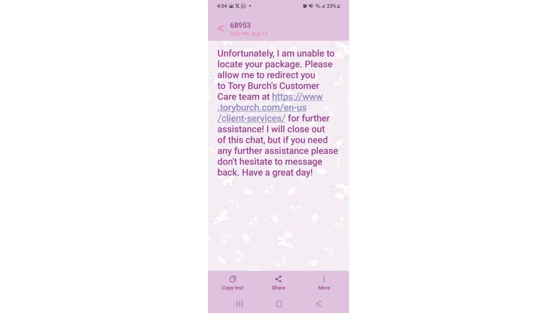 I emailed their customer service and chatted with couple of them online they kept tossing me back and forth to contact the shipping company,I did as you can see attached& the shipping company mentioned they have no information regarding my order & tossed me back to Tony Burch customer service AGAIN, as seen attached.
