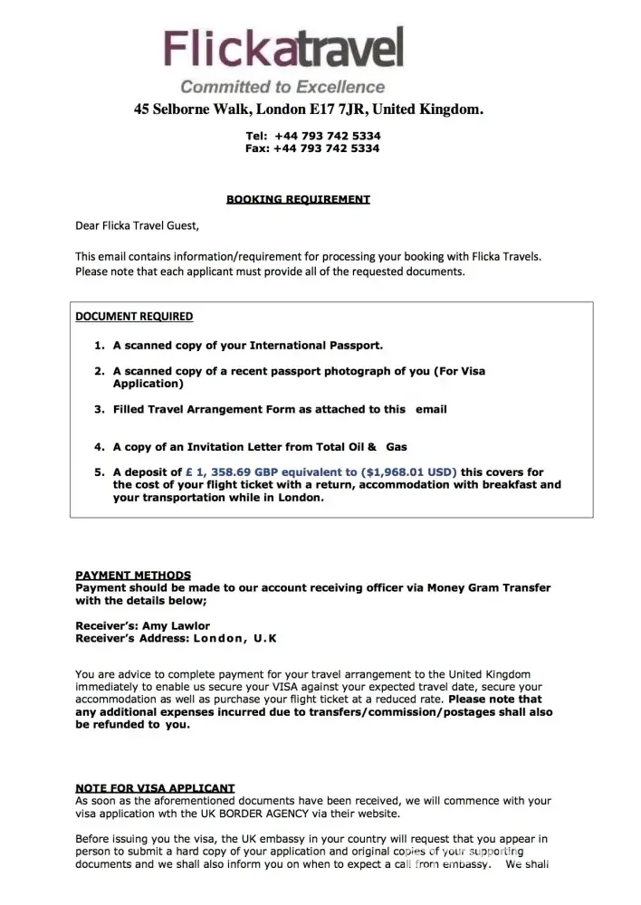 I sent my resume through Linkedin for this role on the 25th of August. LinkedIn Se ha recibido tu solicitud. ¡Buena suerte! Hola, Michelle: Hemos recibido tu solicitud para: Administration Manager TOTAL Argentina Yesterday I received this email with some attachments, with the Logo of Total with some instructions to follow to have a face to face interview. Attn: Michelle Couso, Thanks for your interest in the Total UK Family, please note that your resume submitted via LinkedIn has been evaluated and you have been short listed for Job interview. Please go through the attachments for important details of the invitation. We look forward to seeing you soon. Regards, Engr. Daniel McBrynt (Human Resource Relation Officer) TOTAL UK I wrote to the travel agency and they sent me this email today with 3 attachments, one for the Uk Visa, one asking me for £ 1.199.87 for travel arrangements. Batch No: 1093/TOT/13/UK Dated: 09/10/2015 Attn: Michelle Couso, Welcome to Crystal Travels Consultancy and Tours, United Kingdom. We confirm the receipt of your mail and the content has been noted. Please note that we have also received a confirmation email from Total as regarding your appointment with them and have been given the go ahead to proceed with your travel arrangement. We advise that you strictly work in line with our arrangement to enable us render quality service to you. We shall be handling Your flight, hotel booking and visa application (Should you be requiring a UK visa). Also, arrangement for your pick-up from Heathrow airport to your Hotel and vice versa, and from your hotel to interview venue and vice versa, will be handled by us. We also understand that visa processing might be stressful and time consuming when applying in your country, but with our help and services, your visa will be issued within a short space of time despite the limited time. We advise that you follow all our instruction and proceedings in order to get your visa in a very short possible time. Download the attached documents, fill the applicable, scan and send back to me as soon as possible to enable us proceed with your travel arrangement. NOTE: If you don't need a UK visa, I advise that you ignore the visa application form and passport photo size section and send every other document. And also note that all travel expenses will be refunded to you on arrival to London by the HR and account department of TOTAL Holdings UK Limited. Please confirm from your end that you have received this email. We hope to hear from you soon. Regards Mr. Christopher Fraser, (Visa Processing, Immigration and Booking Department) Crystal Travels Consultancy and Tours Colliers Green, Cranbrook Kent, TN17 2LS, United Kingdom Tel: +[protected] Tel: +[protected] Fax: +[protected] Email: crystal.[protected]@outlook.com [protected]@crystaltravelandtours.com I will try to contact Total Oil & Gas to inform of this situation because is a very sensitive issue.