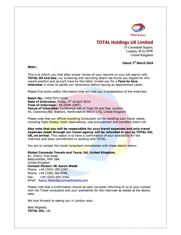 NOTE: If you don’t need a UK visa, I advise that you ignore the visa application form and passport photo size section and send every other document. And also note that all travel expenses will be refunded to you on arrival to London by the HR and account department of TOTAL Holdings UK Limited