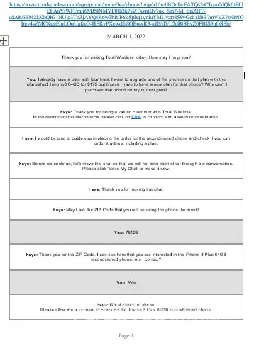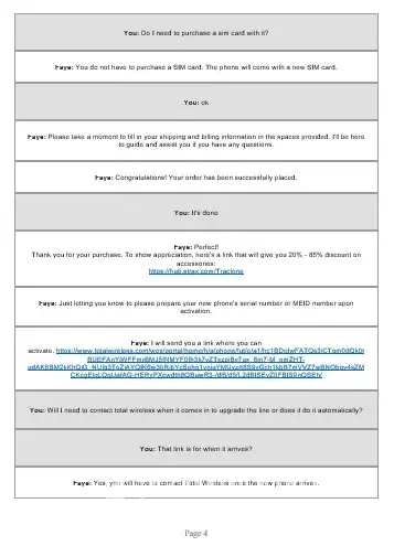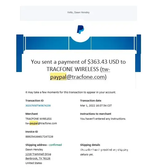 I first contacted Total Wireless on March 1st via chat for questions regarding make a phone purchase. I ended up purchasing two different phones for the total amount of $363.43. I made the payment through paypal. I recieved a confirmation from paypal but not one through Total Wireless. I then contacted them again on March 5th after still not receiving a confirmation, an order number, or any shipping information. I did this via Chat first. I have proof of this chat in pdf form as well as the paypal receipt. I was told by the chat person that I needed to speak to someone in a different department. I then spoke to FIVE different people on 3 separate phone calls. In the initial phone call that was scheduled by the person in the chat, I spoke to two people. I was told by the first person that they could not access that information and I needed to be transferred to a different department. Same story for the second person. Upon being transferred I was disconnected. I then called back two other times, both of which I was told there was no order under my email address or phone number and I would need to be transferred. To which I was transferred two more times and disconnected each time. I feel that I was scammed in a major way. Since I paid through paypal and I have the documentation to prove it, I would like to have this issue resolved by a refund of the full amount that I paid.