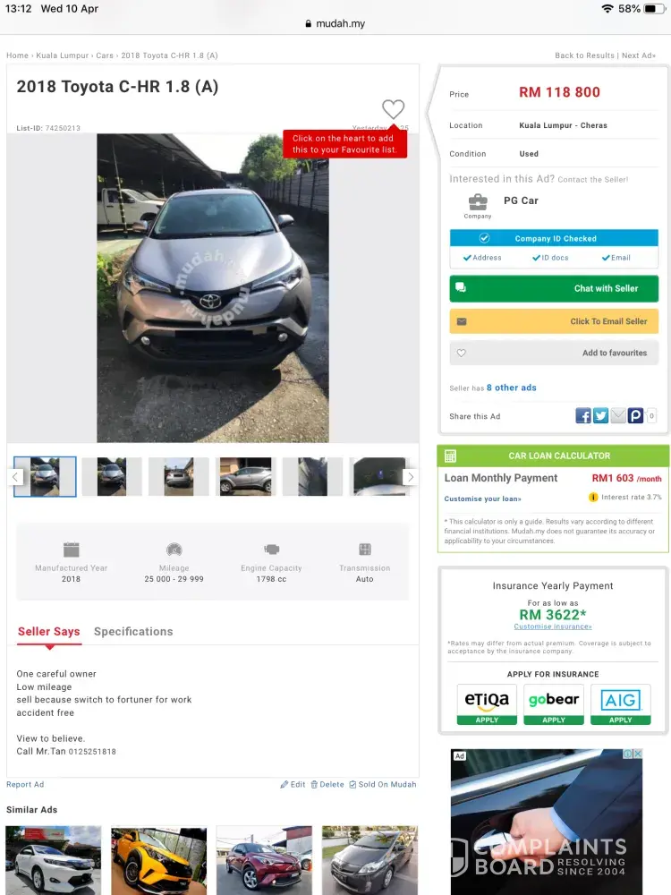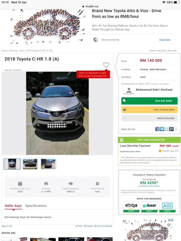 On 8th apr, I was attracted by one advertisement (mudah.com) on toyota c-hr used selling price of 118k. Without hesitation, I immediately contacted the person mr tan for further enquiry. He answered the call & shared that the car since sold. I'm amused with so fast market responded that the advertisement was published on 8th apr 20.30pm & the car was sold at early morning (9th apr). He then counteroffer me whether i'm keen to take a new toyota c-hr since he is sales personnel from toyota shop. I'm then declined the offer.