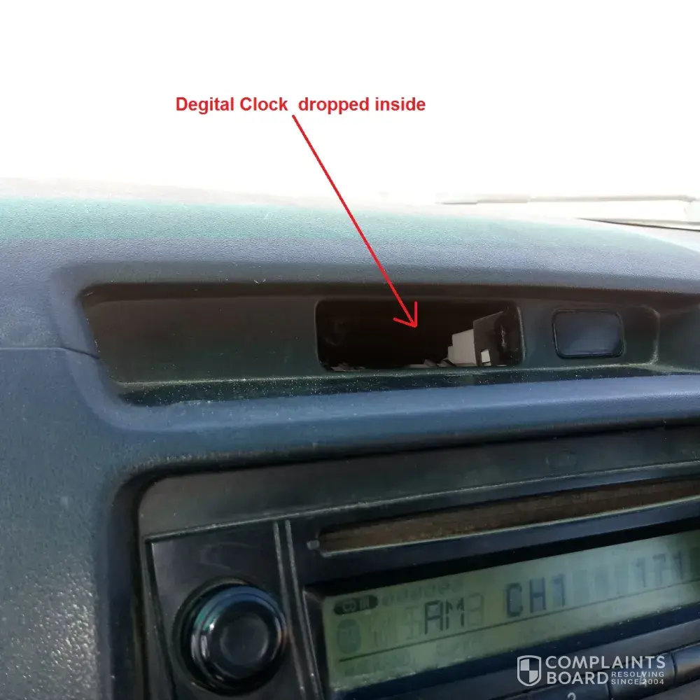 I noticed this problem in many Toyota Hilux cars in Algeria, The digital clock installed on the board has fixation problem and while trying to push button to adjust time the clock drops inside the board as per the attached picture.