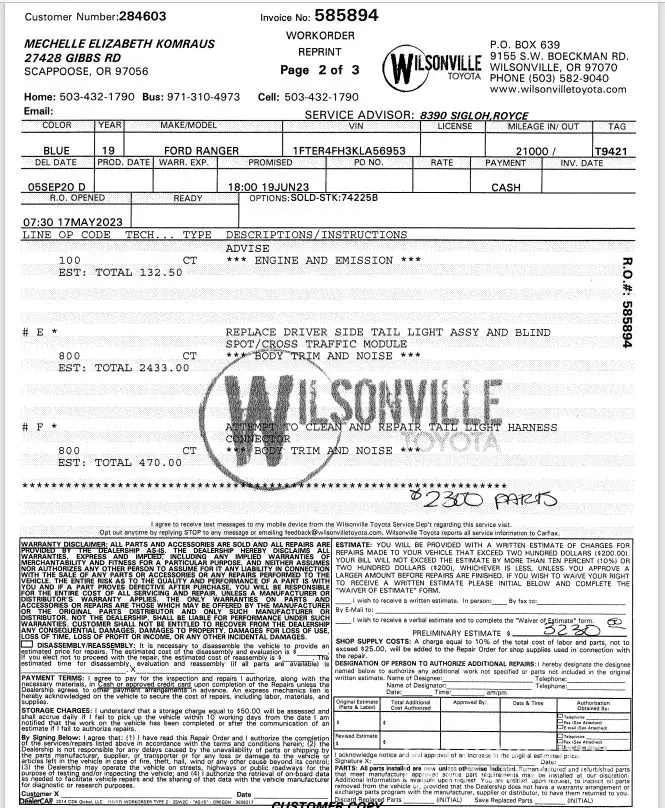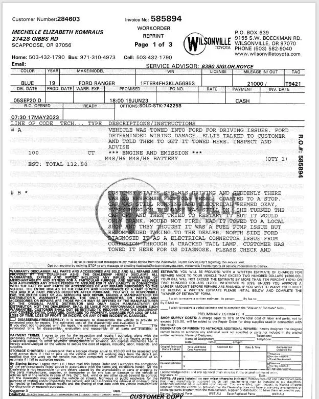 Purchased my 2019 Ford Ranger at Wilsonville Toyota. Ranger has been with the Dealership for repairs since May 16, 2023, not repaired while I am driving a loaner vehicle. Initially, I was lied to repeatedly about the repair needs of my truck as they were trying to pressure me into purchasing a NEW truck from them. Now, almost 3 months later I am waiting for my truck to be repaired, repeatedly lied to.