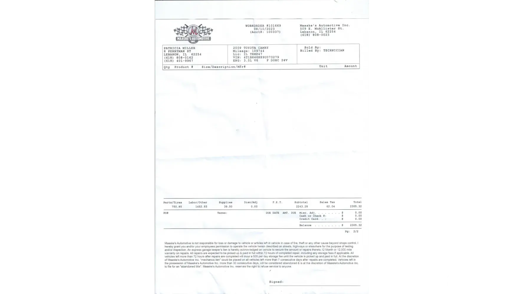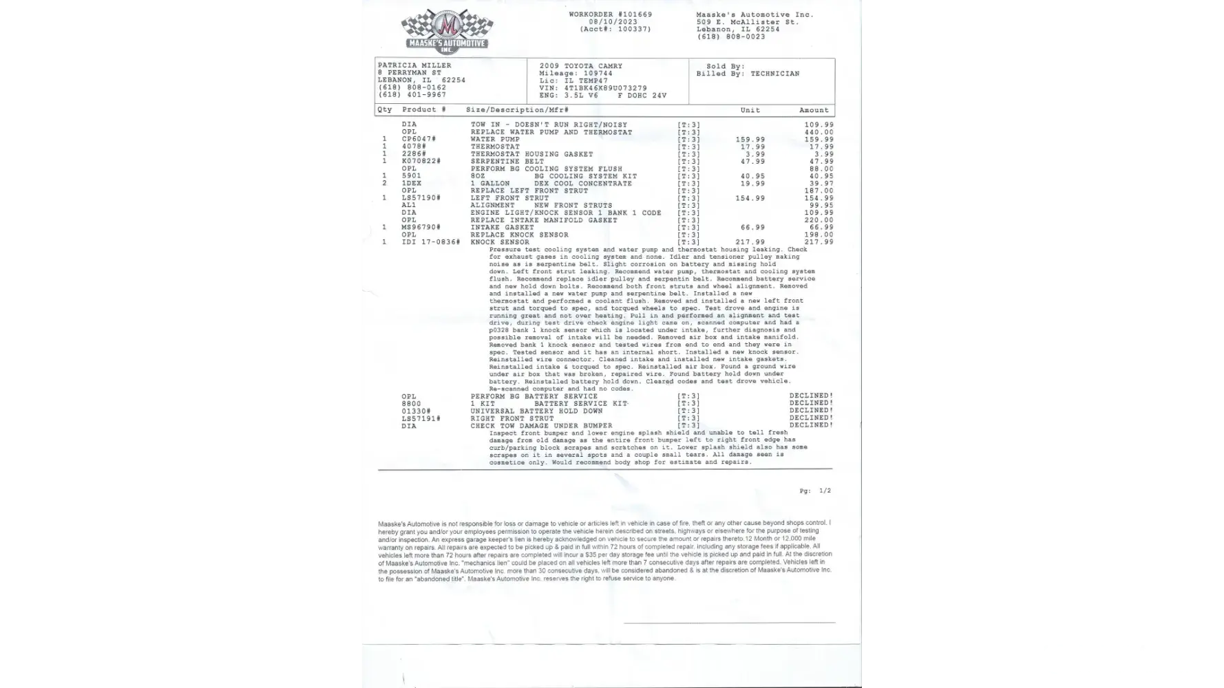 No response from Golling Toyota of Warren as of Aug 10th per your message., we have since had the 2009 Canry fixed including some elective repairs. The toyoto estimate was 9300 + and told us it was a blown head gasket plus other items. We had it towed and repaired locally for 2300 including elective repairs. On July 11th they sold out son and us a 08 Prius using this bogus repair service as a tool to buy another car. The 08 Pries contiues to have issues and the service dept does nothing.