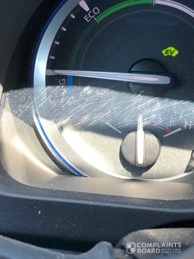before the sale. He approved another trip to yet another ineffective detail shop which again proved unsuccessful. The 2 Nd to the last time I spoke to Savannah she told me that Toyota would replace the instrument panel and the bumper guard but that I would have to pay the labor to have them replaced even though I had nothing to do with the scratches on the pieces. Incidentally my car had been averaging 20.5 mpg despite the advertised estimate being 29/31. Savannah the case manager said I needed to drive with a service technician to
