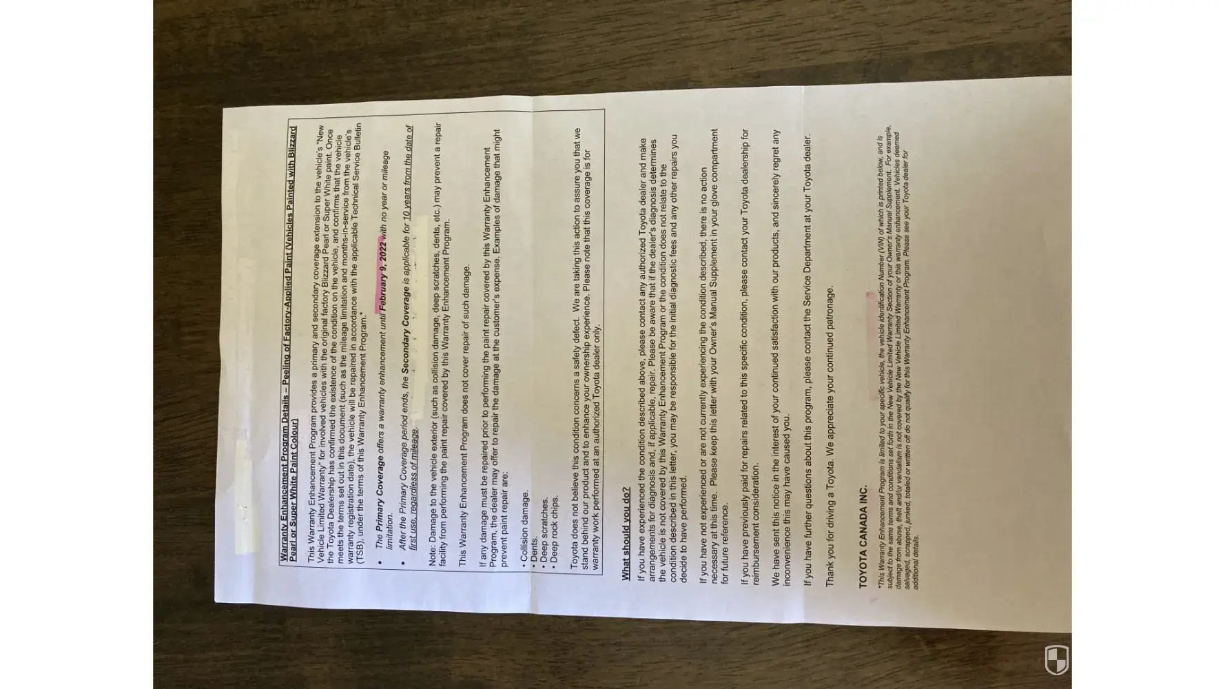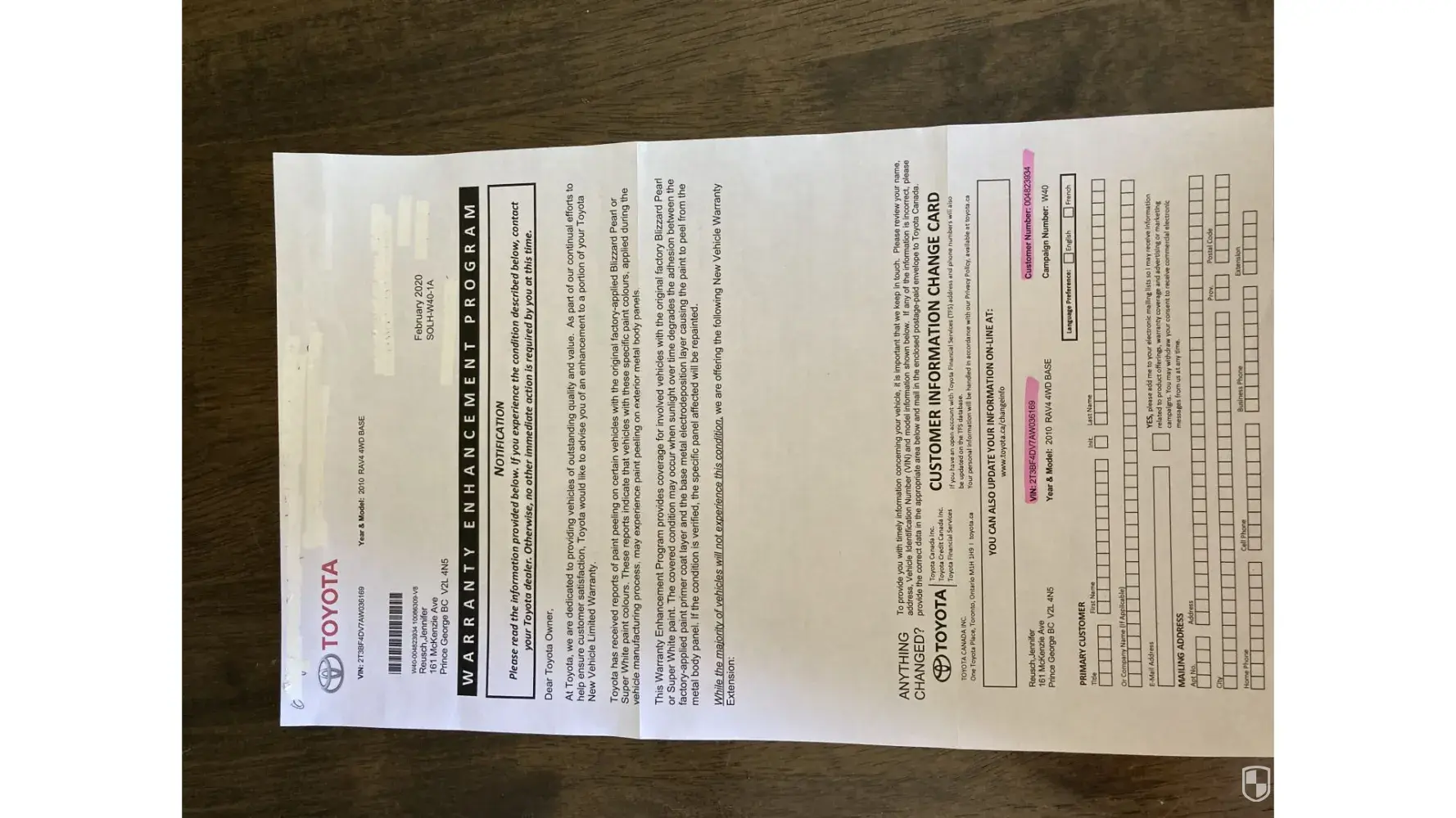 I purchased a 2010 White Rav4 in 2014 from the Toyota Dealership in Prince George, BC. Within a few years, I noticed several areas of the car where the paint was chipping off and discolouring. I received a notice from Toyota Canada about a Warranty Enhancement Program dealing with paint peeling off white Toyota vehicles in February 2020. The notice arrived at the start of the Covid-19 pandemic where protocols were in place for people to stay home and avoid unnecessary business. I abided by these rules as stated by the PHO.