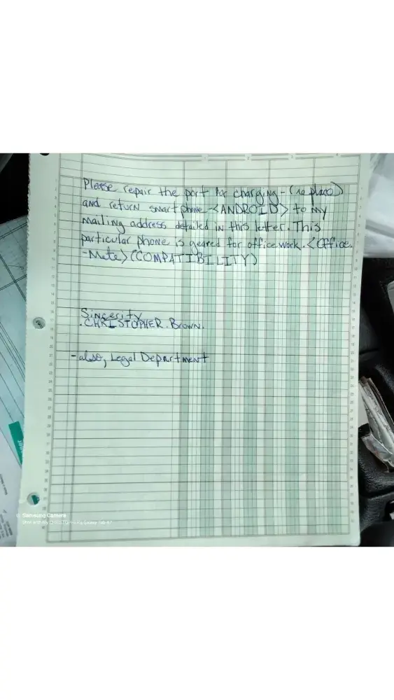 Desired outcome: My name is: CHRISTOPHER.Brown; Packing address provided: U.S.A. Postal Service, (North Broadway) Post Office Box 753, JERICHO, New York 11753. Repair: port (for charging). Return: smartphone . Phone needed back in any matter of repair.